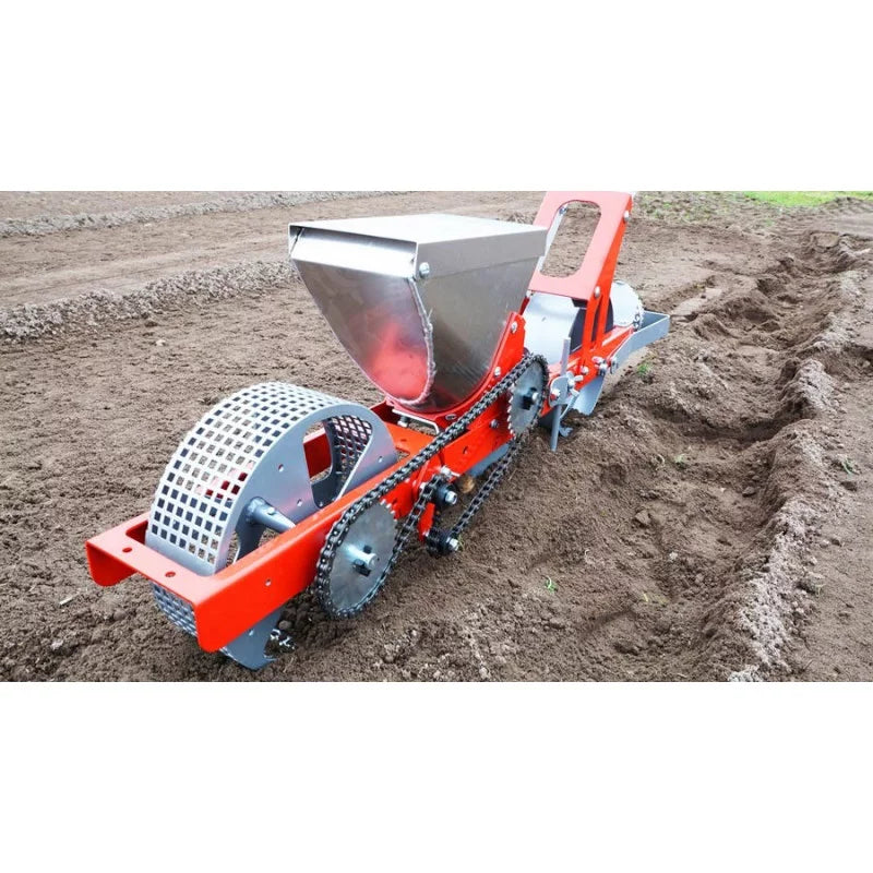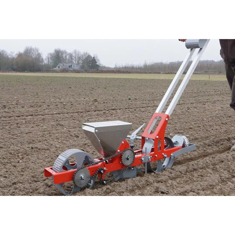 A hopper base plate is provided with this seeder for reducing the volume of the hopper. It is very useful when you are sowing small batches of seeds.